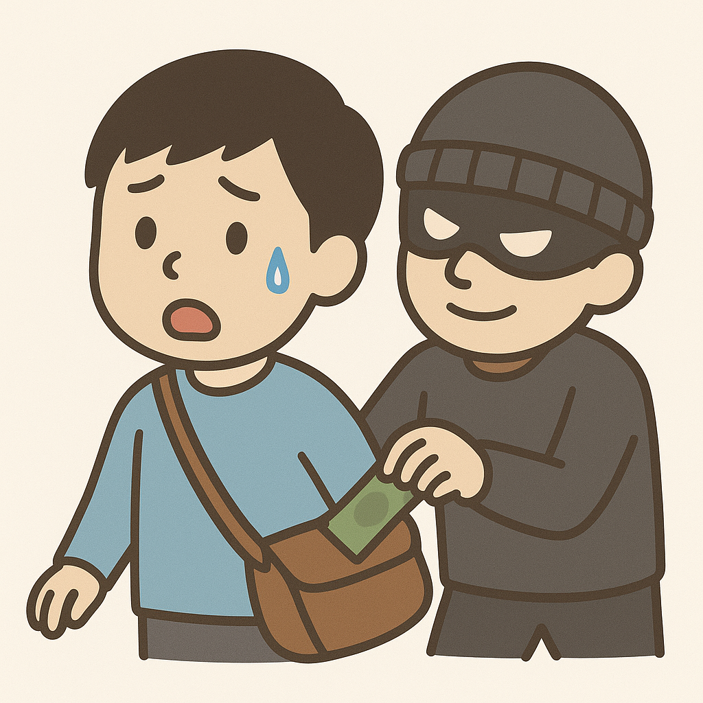 - スリ (suri) – pickpocketing (taking from someone’s pocket/bag while they’re carrying it)