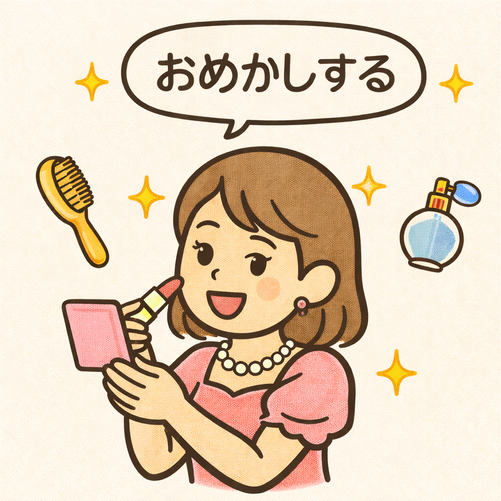 “おめかしする” (omekashi suru) is a Japanese expression that means to dress up nicely or get dolled up, typically for a special occasion or outing.