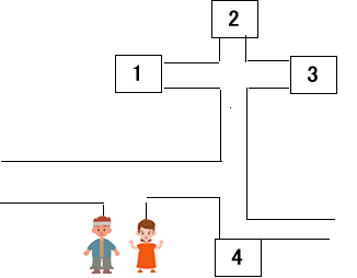 質問:男の人がレストランの人にお手洗いの場所を聞いています。男性用のお手洗いはどこにありますか。 男:すみません。お手洗いはどこにありますか。 女: この廊下をまっすぐ行ってください。突き当たりましたら、右へ行くともう一度突き当たりますから、今度は左へ行ってください。 男:右へ行って、左へ行くんですね。 女: はい。それで、少し行って右へ入った奥が男性用です。 質問:男性用のお手洗いはどこにありますか。 答え: 3