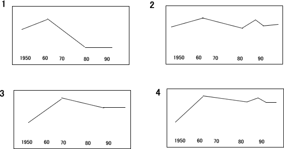 質問:下のグラフはある地域のコーヒーの生産の変化を示しています。正しいものはどれですか。 男:1950年代から70年代にかけて、コーヒーの生産は急激に増え続けていますが、1970年をピークとして次第に生産が減り、90年以降はあまり変化していません。 質問:正しいものはどれですか。 答え: 3