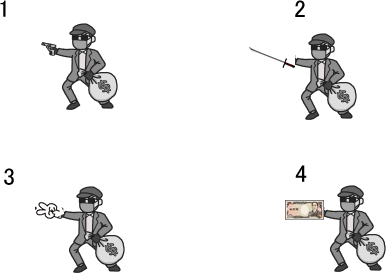 M:黒っぽい服を着た男が入ってきて、いきなりピストルを見せ「金を出せ!」とすごむのです。