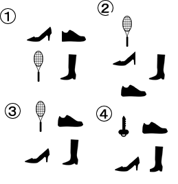 質問:玄関にお母さん、お姉さん、小さい子供のくつがあります。どう並べればいいですか? 男:お母さんのくつは一番左に置いて。テニスラケットの近くには子供のくつを。 お母さんのくつの右にお姉さんのくつを置いて。 質問:どう並べればいいですか? 答え: 3