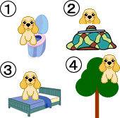 質問:男の人と女の人が話しています。女の人の犬はどれですか? 男:ペットがいますか? 女:ええ、犬と猫がいます。 男:玄関にいたのは? 女:あれはうちの猫です。 男:そうですか。ベッドで寝てるのはあなたの犬ですか? 女:あれは隣のです。うちのはトイレにいます。 質問:女の人の犬はどれですか? 答え: 1