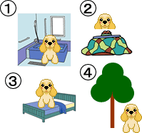 質問:男の人と女の人が話しています。犬は今どこにいますか? 女:買い物行ってきたんですか? 男:はい、犬と一緒に。 女:いいですね。 男:あれ?うちの犬どこいったかな? 女:さっきは庭で遊んでいましたよ。 男:いつもコタツの中で寝てるのに。 女:あっ、お風呂場にいましたよ。 質問:犬は今どこにいますか? 答え: 1