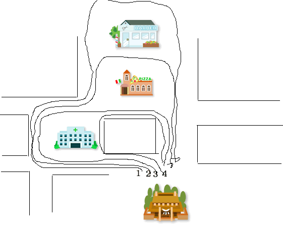 男:今日のマラソンのコースを発表します。 このコースは神社から病院、レストランを回って、また学校に戻ってくるコースです。
