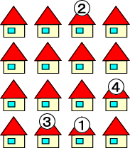 質問:男の人と女の人が話しています。男の人の部屋はどれですか? 女:どの部屋に住んでいるんですか? 男:四角い形の窓の部屋です。 女:四角い形の窓の部屋はたくさんありますよ。 男:一番下の左の角から3つ目です。 質問:男の人の部屋はどれですか? 答え: 1